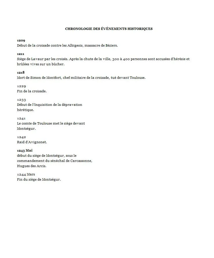 Sud de la France, 1236 : Esme, un enfant de la forêt insouciant, est pris dans les premiers jours de l'Inquisition. Son frère adoptif bien-aimé, Raimond, est pris en charge par l'inquisiteur, le frère Pierre Tique. Frénétique, Esme les suit. Son voyage tortueux la conduit à Carcassonne, Foix et finalement à Montségur. Là, elle est attirée par la vie simple qui règne au sommet de la montagne. Au fur et à mesure qu'elle apprend à connaître leurs coutumes et leurs pratiques, elle comprend mieux le lien qui unit la communauté à la lignée de Jésus et de Marie-Madeleine ...